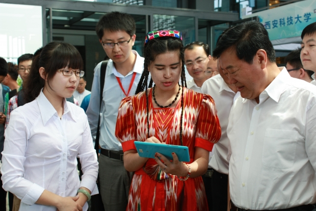 西電參賽學子為省人大常委會副主任李金柱展示作品《維吾爾文手寫輸入法》