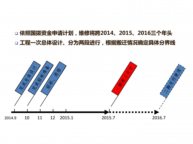 據了解,此次主樓維修工程一次總體設計、分為兩段進行,將跨2014、2015、2016三個年頭,具體還將根據搬遷情況確定具體分界線。