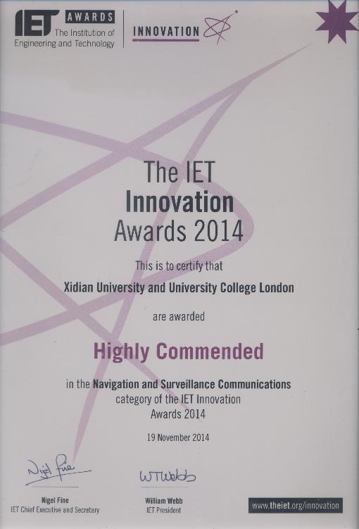 11月19日,第10屆英國工程技術學會(IET)年度創新獎頒獎儀式在英國倫敦舉行。由西安電子科技大學與倫敦大學學院(University College London, UCL)聯合申報的“Advanced bistatic radar system for multitarget localisation(先進的雙基地雷達系統多目標定位)”獲得“Navigation and Surveillance Communication(導航監視通信)”領域提名獎(Highly Commended Award),成為本年度該領域五項獲獎項目之一。