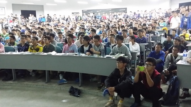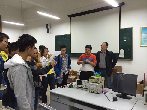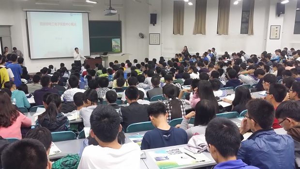 2014年9月15日晚,大雨,可是在新校區D樓206教室,能容納約500余人的教室座無虛席,過道也站滿了學生。我校國家級電工電子實驗中心在這里舉辦電子信息類新技術實驗課程及創新設計講座,電工電子實驗中心第一次舉辦這樣的講座,沒有預見到學生的熱情這么高,連給與會的老師預留的座位也被學生搶占,新技術實驗課程的很多老師都站在了走廊上。