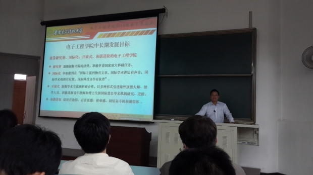 一段段流金歲月展現在眼前,帶給同學們的不僅是對電院的了解,更是寄予給同學們電院的精神。廖桂生介紹了學院的組織機構,以及電院的師資力量。電院擁有中科院院士一名,國家級教學名師2人,專任教師284人,教師博士率高達百分之八十,中青年教師是學院的中堅力量。近三年,學院平均科研經費超過一億元,擁有多項國家級科技獎項。這些都是電院的驕傲與自豪。院長用先輩們的勤奮鉆研,卓越成就,激勵我們鼓舞我們,艱苦樸素,積極進取,傳承電院的優良學風,電院在師生員工的共同努力下會創造新的輝煌。