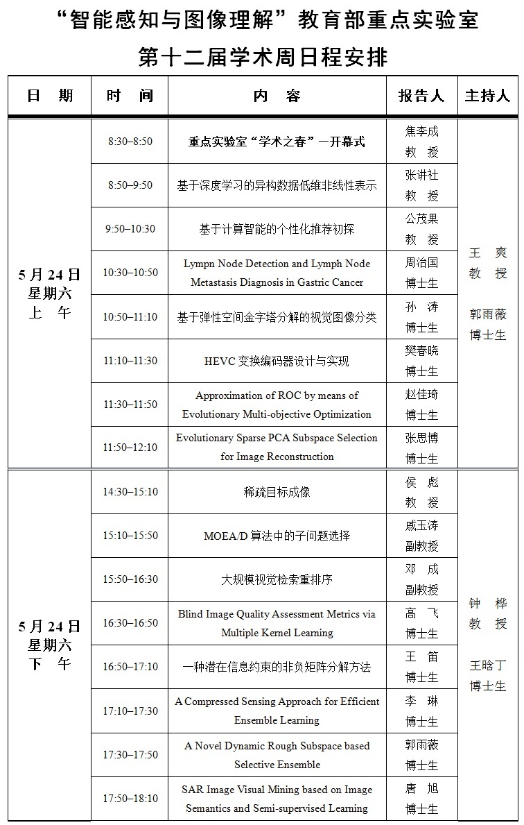 “智能感知與圖像理解”教育部重點實驗室第十二屆學術周日程安排 2014-05-22 12:52:00 瀏覽次數: 上一篇文章:關于召開2014年專業技術職務評審相關事宜的通知 下一篇文章:第九屆青年教師講課競賽結束 電院教師成績優異