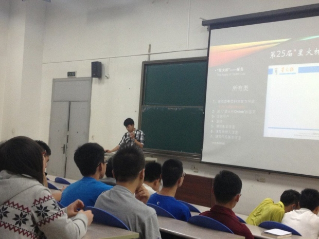 開始時,學長們描述了他們眼中的星火杯,并為大家介紹星火杯的參賽流程,鼓勵大家積極參與。此時大家對星火杯有了初步了解。接下來學長用ppt向大家展示了歷屆的參賽作品,參賽同學們的創意與實踐能力立刻吸引了大家的目光,讓人贊嘆。并告訴同學們:團結、堅持是我們參加星火杯必須具備的條件。之后學長向我們中肯的講述了他的經驗給了我們更為具體的忠告。最后張碧輝從大局上簡明扼要的講解了整個報名流程。PPT制作簡約且條理清晰,讓同學們清楚直觀的了解整個過程,重點強調出了報名與往年不同之處:網上報名。使得大多數對此還不曾了解的同學,不會與星火杯失之交臂。并且他還指出了幾處報名易錯點,讓同學們都有了各自不同的收獲。