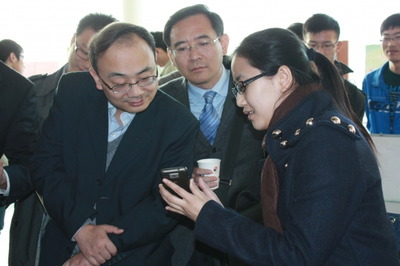 華為創新俱樂部學生為華為公司領導介紹俱樂部的手機軟件作品