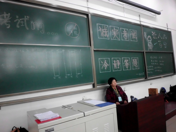 各班級創作的黑板報中,有貼近學生語言的醒目標語,還有生動活潑的配圖。所有黑板報中同時包含考場負責人、本考場黨員等信息,充分發揮了學生干部的帶頭示范作用。黑板報中還公布了學院考試違規違紀舉報電話,以嚴厲打擊考試違規違紀行為。