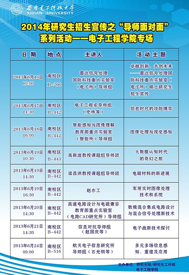 2014年研究生招生宣傳之“導師面對面”活動—電子工程學院專場 2013-06-14 12:07:00 瀏覽次數: 上一篇文章:2013屆畢業生離校工作安排 下一篇文章:關于辦理2013屆本科畢業生一卡通和網絡賬戶余額清退及注銷手續的通知