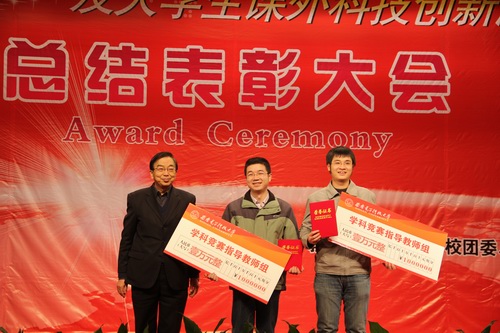 謝楷老師和付少峰老師分別代表電子設計競賽和嵌入式競賽指導教師組上臺領取了“優秀指導教師組”證書和獎金。大會還向獲得學校學科競賽“優秀組織單位”的電工電子教學中心頒發了獎牌和獎金。同時,大會也向各競賽獲國家一等獎的參賽隊頒發了證書。