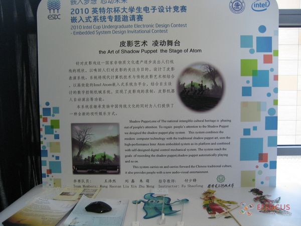 這就是我們在古裝電視劇里常見的皮影演示。在那些個缺少光影,沒有霓虹的年代,這個需要大量人力,大量前期準備的娛樂項目是只有官宦人家才能享受到的奢侈。而在2010年英特爾杯嵌入式專題邀請賽頒獎儀式的展廳里,通過基于凌動平臺的開發,這項古時需要數十人才能完成的劇目可以在無人檢測的情況下按照預先設計好的順序一出出演繹。