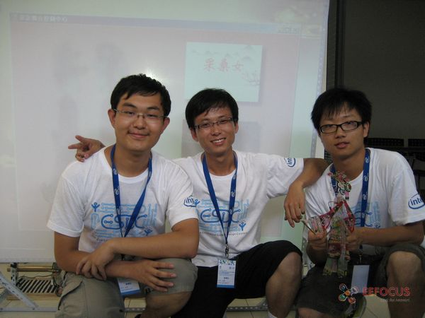 2010年英特爾杯嵌入式邀請賽英特爾杯獲獎團隊----來自西安電子科技大學的“皮影藝術,凌動舞臺”項目團隊,從左到有分別是王浩然,劉鑫以及朱蔭