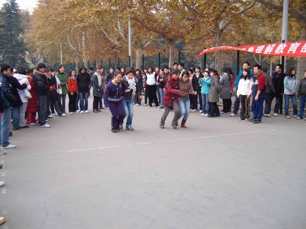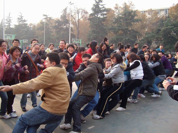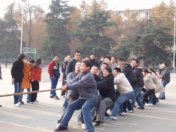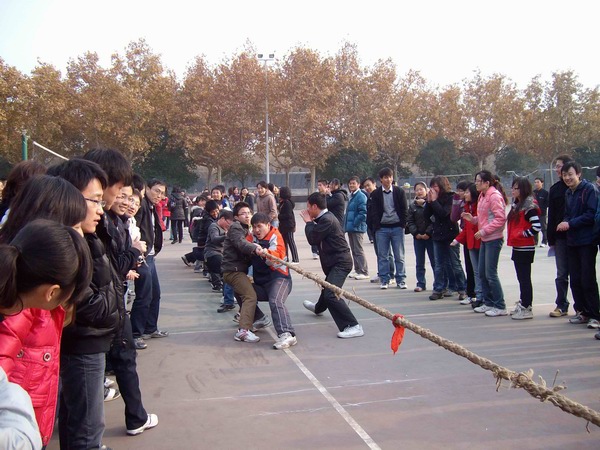一聲哨響,全場最引人注目的拔河比賽正式開始。在雙方15名男生加5名女生的陣型基礎上,比賽采取三局兩勝制。雙方隊員愈戰愈勇,而拉拉隊員也憋足了力氣喊起口號,各年級種子隊更是齊聚了本年級的大力水手們一展勇力,充分發揮團隊的力量。當拔河比賽進行到半決賽的時候,其他幾個項目也分區域展開。在比賽組織方的周密部署和各項目負責人的通力配合下,各組參賽隊員很多都是男女生搭檔,在突出個人能力的同時更加注重默契和協作。踢毽子和跳繩是女生們最為親睞的項目,平日里在實驗室伏案,專心于學術的智能所學子們,紛紛變得生龍活虎,巾幗不讓須眉。而用球拍帶乒乓球接力的趣味乒乓球賽,和隊員來回傳球的互動排球賽,則是男生們大展身手的時機,大家信步穿梭,驕如龍健如虎。更為有趣的雙人障礙跑,盡管有步伐一致上的障礙,但男女生的默契配合明顯在賽場上顯示了其優勢,你來我往其樂無窮。在其他幾個項目都決出冠亞軍之后,拔河總決賽中,研三隊獨占鰲頭,而研二隊則獲得了第二名。同時,教師代表也同大家進行了一場拔河友誼賽,師生同樂,彼此間的親密更進了一層。