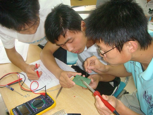 5月10日上午九點,大學生活動中心I-213座無虛席,大一220余名同學冒雨來到大學生活動中心,比賽在簡短的開幕式后正式開始。雖然大一同學對相關知識掌握不是很全面,但大家對此表現出了極大地熱情,有很多同學在比賽宣傳初期就開始學習相關知識和練習焊接技術,在現場表現了較高的水平。在近三個小時的比賽中,大家都一絲不茍,目光中充滿了對知識的渴望。當比賽進行到作品調試階段時,大家都屏氣凝神,調試成功的同學都非常激動,賽場上發出陣陣歡呼聲,很多同學都要求吧圖紙帶走留作紀念。