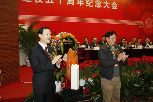會上,還進行了校友捐贈儀式。柳傳志校友因故不能出席,特向母校致信祝賀,并向學校捐贈了聯想集團為2008年北京奧運會設計的祥云火炬。深圳校友會捐獻了精心設計的大理石水晶紀念杯,新疆校友會捐獻了工藝畫。段寶巖校長和校友會代表一起為捐贈紀念品揭幕,并向他們頒發了捐獻證書。