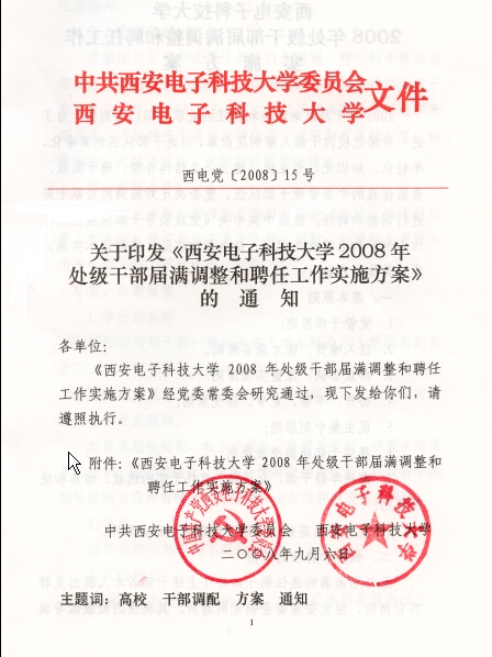 西安電子科技大學2008年處級干部屆滿調整和聘任工作實施方案 2008-09-10 12:09:00 瀏覽次數: 附件: 1.西安電子科技大學2008年處級干部屆滿調整和聘任工作實施方案 2.西安電子科技大學干部應聘申請表 3.西安電子科技大學干部民主推薦表 信息來源:西電新聞 原文地址:http://www.xidian.edu.cn/dispnews.asp?typeid=2&newsid=1922 上一篇文章:祝福獻恩師 慶祝2008教師節表彰大會召開 下一篇文章:教師節快樂!