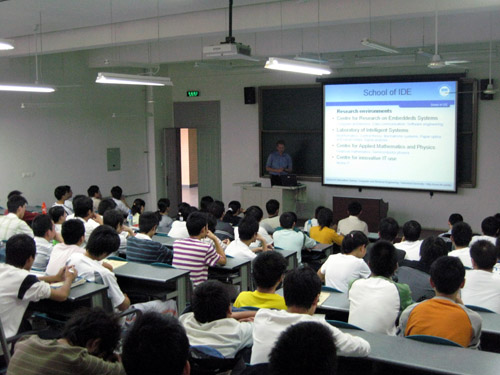 兩位學者參觀了國家電工電子教學基地和新校區,并先后在我校老校區科技樓小報告廳和新校區B樓414面向我校師生作了三場學術報告,報告題目分別為《Introduction about Halmstad University---IDE》,《Research area in Embedded Computer Systems》和《Research area in Intelligent Systems》。他們在報告中詳細介紹了Halmstad大學本科生和碩士生的專業設置和培養方案,重點介紹了智能系統實驗室和嵌入式系統研究中心的研究方向和目前所取得的研究成果,演示了大量的工程實物照片,并就同學們所關心的問題一一進行了解答。