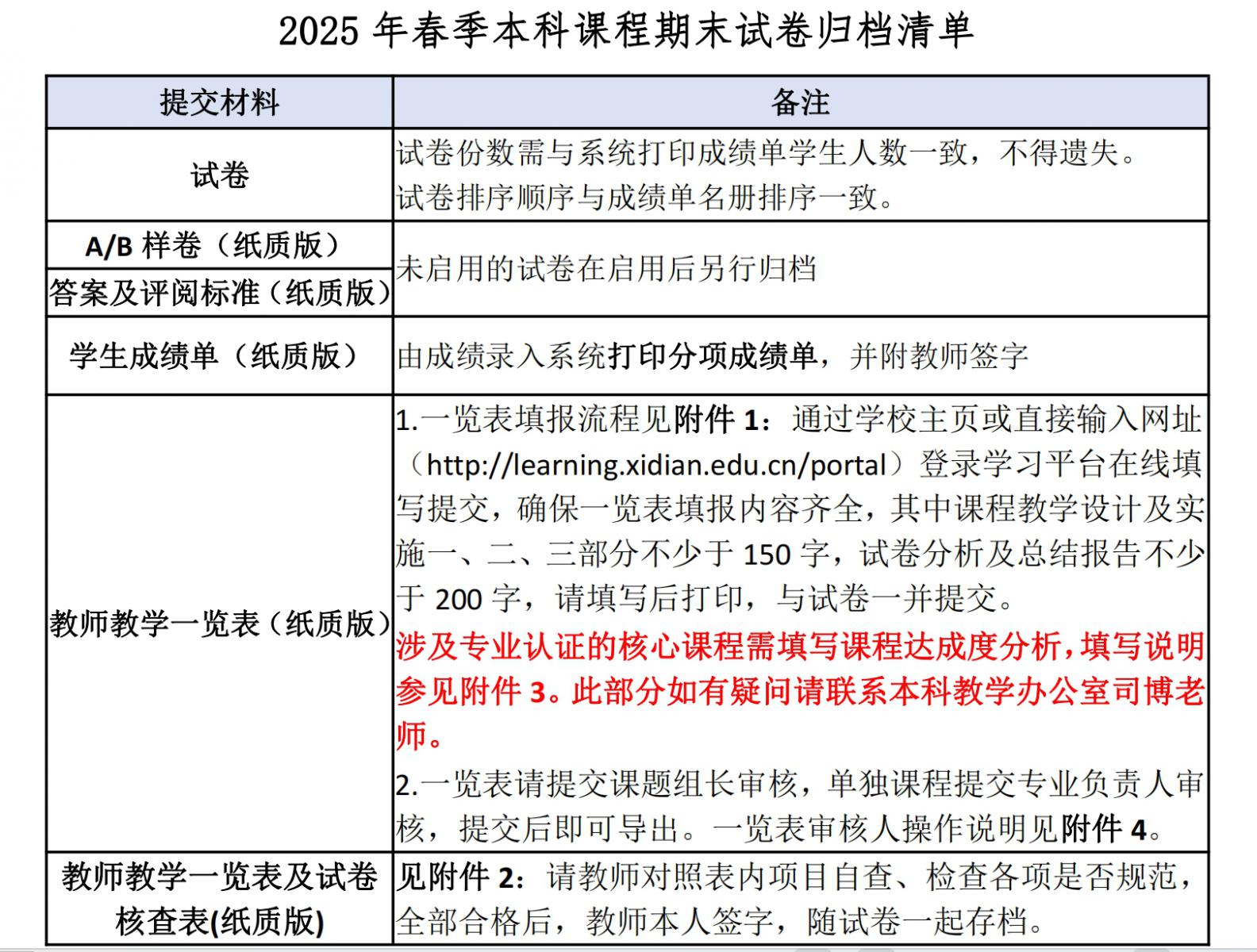 1.以上材料請于7月14日前提交,紙質歸檔材料交至本科教學辦公室(圖書館B區439室),電子版材料按照“2025春+課程名稱+任課教師”命名文件夾,發送至dybkjx@xidian.edu.cn。