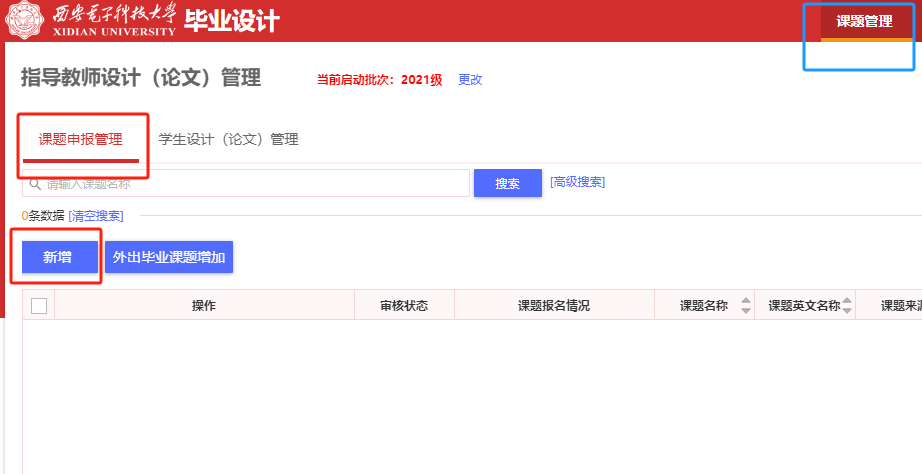 (1)10月9日(星期四)至10月29日(星期三),教師登錄學校教務系統(http://ehall.xidian.edu.cn/)中的“畢業設計”模塊出題,題目上傳時要注明題目來源、性質、課題研究方向、課題簡述及任務要求,審題學院選擇教師所在學院,并提交任務書(教育部抽檢論文時會調取題目來源、性質、課題研究方向等信息,務必準確)。任務書模板見附件1,任務書中學生信息暫不填寫。