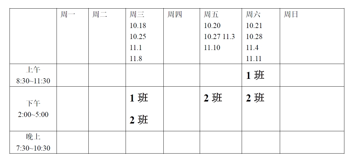 每個班每周上2次課,每次課4課時,總共4周,時間安排如下表。如有時間沖突,同學們可以少量自行聯系兩-兩間調換。