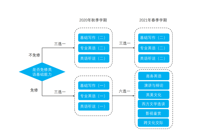 免修英語基礎能力(X1FL0000)(即英語能力等級認定為A級)的碩士研究生在“三選一”和“六選一”課程中各選一門; 不免修英語基礎能力(X1FL0000)(即英語能力等級認定為B級) 的碩士研究生在“三選二”中選擇兩門(2020秋季一門、2021春季一門,兩門課不可放在同一學期且不可為相同課號課程)具體課程和流程見下圖所示: