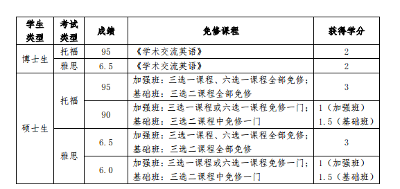 為適應研究生教育的新形勢,推進研究生教育的國際化,針對我校研究生英語教學特點,對全體研究生的英語教學進行改革,除參加學校統一開設的英語課程獲得學分外,可以通過參加托福或者雅思考試達到相應分數來獲得學分。擬參加托福/雅思考試的學生,可憑借考試成績,辦理相關英語公共課課程免修與學分認定,成績與學分轉換如下表: