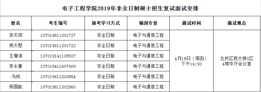 2、電子工程學院2019年非全日制碩士研究生招生復試面試安排(第二批)見下表,請及時查看并按要求到指定地點參加面試。無故未參加面試者視為自動放棄!