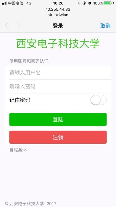 北校區碩士研究生關于無線登錄頁面激活賬號的通知 2017-11-06 16:06:00 瀏覽次數: 全體碩士研究生: 為加強個人賬戶安全管理,暢通溝通渠道,現系統需完善個人常用手機號及郵箱等聯絡方式,請您配合完善后再登陸。激活過程中如有疑問請撥打88201252或88201650 激活方式: 1.筆記本電腦或手機連接stu-wlan,彈出如下圖所示頁面(如果未自動彈出,請在瀏覽器輸入10.255.44.33) 2.輸入用戶名密碼,點擊登錄。彈出如下所示頁面,按提示操作即可 3.彈出如下界面,說明激活成功,激活成功后重新輸入用戶名密碼即可成功登錄。 上一篇文章:關于做好2016~2017學年研究生評優工作的通知 下一篇文章:2017年度天線與微波技術重點實驗室學術年會征稿啟事