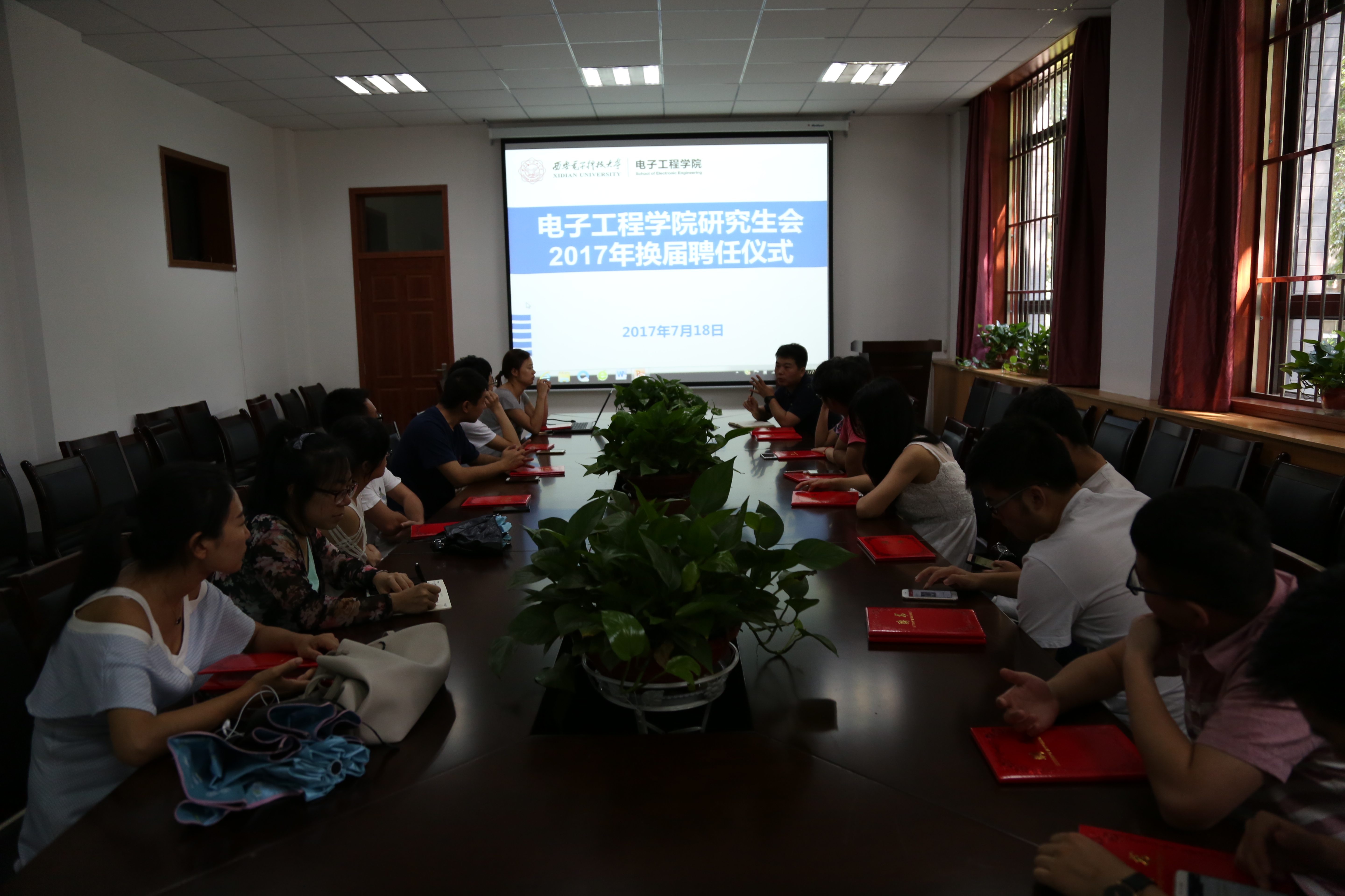 (通訊員:侯敏)7月18日下午,在西大樓Ⅲ區109會議室,電子工程學院研究生會舉行了2017年換屆聘任儀式。電子工程學院研究生輔導員鄧鑒老師、電子工程學院研究生會主席張寶譽以及研究生會的同學參加了本次聘任儀式。