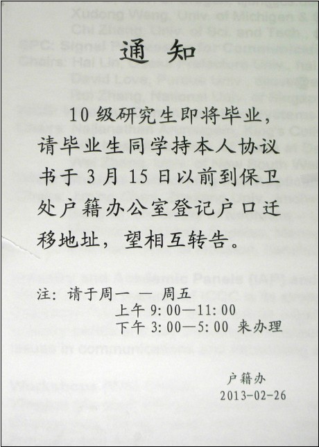 2010級研究生畢業生到戶籍辦登記戶籍遷移地址 2013-03-03 16:37:00 瀏覽次數: 上一篇文章:關于2013屆碩士研究生學位申請的通知 下一篇文章:關于2013屆碩士研究生學位論文評優的通知
