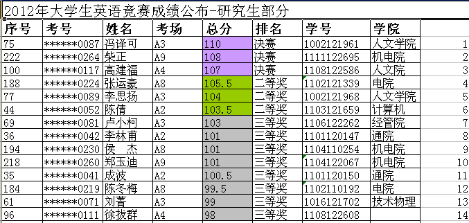 2012大學生英語競賽初賽成績公布(研究生獲獎名單) 2012-04-28 14:15:00 瀏覽次數: 參加英語競賽同學: 2012年大學生英語競賽初賽成績公布(見附件),三名研究生同學進入決賽。 2012大學生英語競賽成績公布-研究生部分.xls 決賽時間:5月13日上午9:00-11:00 決賽地點:北校區西大樓。 注意: 1、獲得決賽資格選手務必于當天早晨8:30分以前進入考場(8:45分播放指令以及聽力); 2、當日考試結束后,上午11點20分左右,請我校選手在西大樓下集體照相,勿誤。 3、準考證發放時間另行通知。 外語系 來源http://gr.xidian.edu.cn/newsfile/3825.html 上一篇文章:關于公布“西安電子科技大學2012年秋季考博成績”的通知 下一篇文章:2012級碩士研究生繳費確認名單4月27日