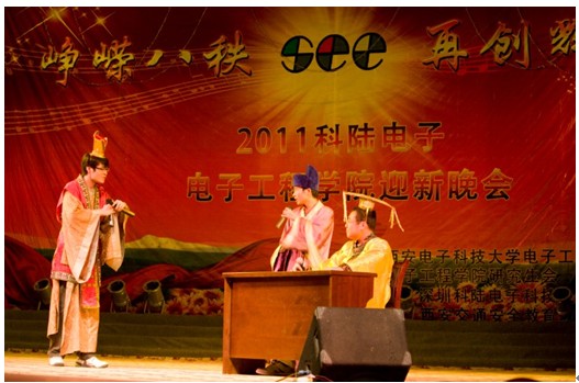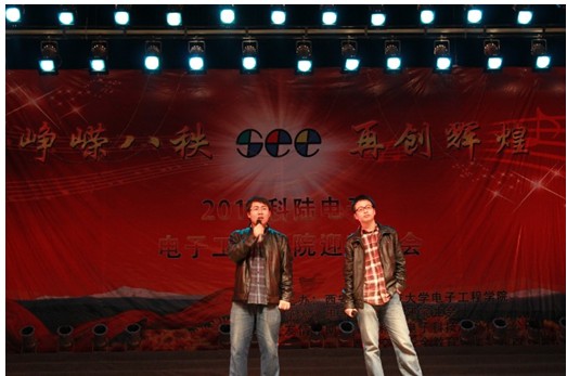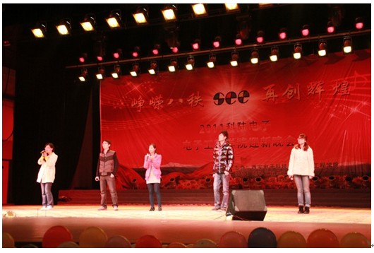 2011年11月18日晚,電子工程學院2011級迎新晚會在校大禮堂隆重舉行。此次晚會以“崢嶸八秩,再創輝煌”為主題,旨在用電院研究生們的青春與風采為我校80周年校慶獻禮。