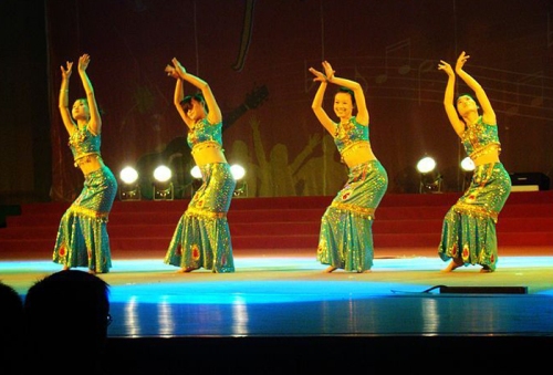 比賽開始,由崔佳等4名女生帶來的傣族舞《有一個美麗的地方》第二個出場。柔美的音樂,婀娜的舞姿,讓觀眾們仿佛置身于仙境之中。身穿藍色服裝的傣族姑娘們舞動著生活的美好,感動著在場的每一個人。