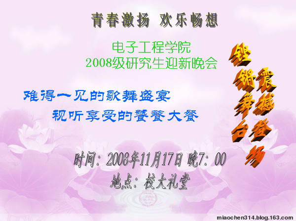 歡迎參加2008電院研究生迎新晚會 2008-11-15 12:00:00 瀏覽次數: 友情贊助:淘花園同校購物網 http://www.xidian.cc 來源:http://bbs.xdnice.com/topic10006t406683t11p2.html 已經登記過的需要電院迎新晚會門票的人員請進http://bbs.xdnice.com/topic10006t406929.html 上一篇文章:電院2008研究生迎新晚會現場剪影 下一篇文章:11月17日晚,電子工程學院研究生迎新晚會,等你來!