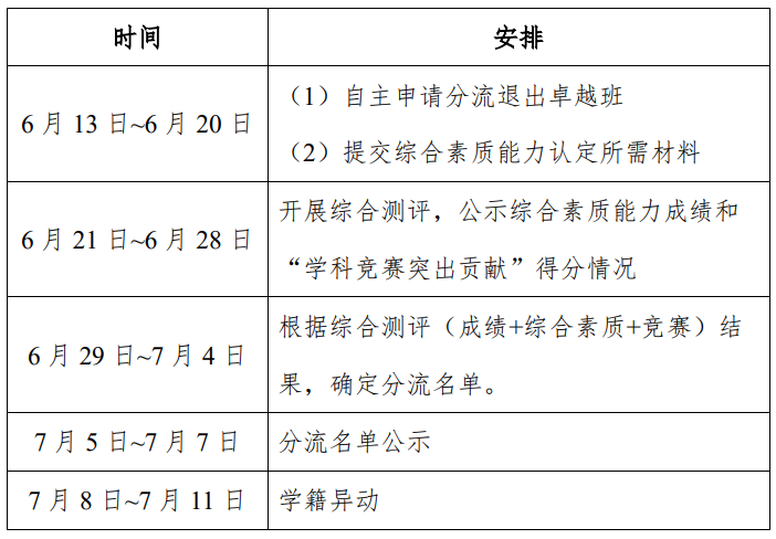 分流退出的學生分流不分班,仍在卓越班按照培養方案完成第4學年學業,符合畢業、授位條件者頒發本科畢業證及學位證,不再進行六年一貫制培養;經過分流退出計劃的學生不列入本碩六年一貫制培養計劃,不予安排推薦免試攻讀碩士學位研究生名額。