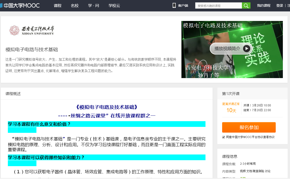 由我院國家級教學名師孫肖子教授和趙建勛教授主講的中國大學MOOC課程《模擬電子電路與技術基礎——“絲綢之路云課堂”在線開放課程群之一》已于3月13日在中國大學MOOC平臺上線運作,將在3月28日開始授課。請點擊以下鏈接觀看課程介紹并報名參加: