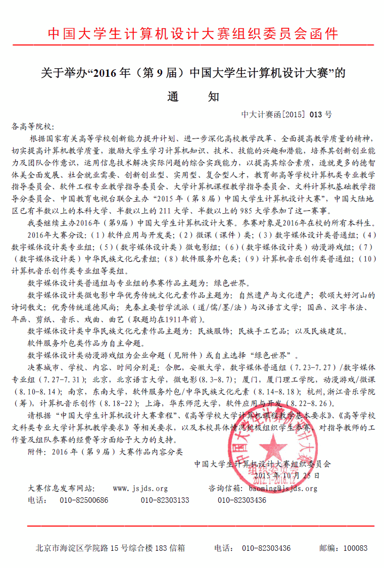 根據國家有關高等學校創新能力提升計劃、進一步深化高校教學改革、全面提高教學質量的精神,切實提高計算機教學質量,激勵大學生學習計算機知識、技術、技能的興趣和潛能,培養其創新創業能力及團隊合作意識,運用信息技術解決實際問題的綜合實踐能力,以提高其綜合素質,造就更多的德智體美全面發展、社會就業需要、創新創業型、實用型、復合型人才,教育部高等學校計算機類專業教學指導委員會、軟件工程專業教學指導委員會、大學計算機課程教學指導委員會、文科計算機基礎教學指導分委員會、中國教育電視臺聯合主辦“2015 年(第8 屆)中國大學生計算機設計大賽”,中國大陸地區已有半數以上的本科大學、半數以上的211 大學、半數以上的985 大學參加了這一賽事。我委繼續主辦2016年(第9屆)中國大學生計算機設計大賽。參賽對象是2016年在校的所有本科生。