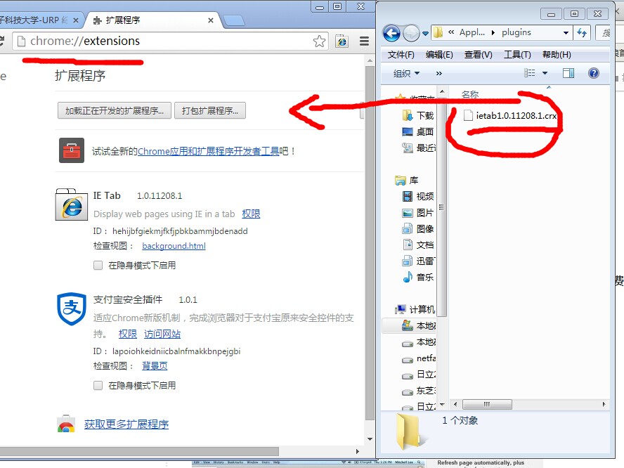 首先 點擊下載IE Tab for Chrome瀏覽器插件, 并解壓出IE_Tab_extension_3_9_20_1.crx 文件,打開 Chrome 的 擴展設置界面 (在Chrome設置里面有) 直接拖動 IE_Tab_extension_3_9_20_1.crx 文件到 Chrome界面里面,即可安裝成功。