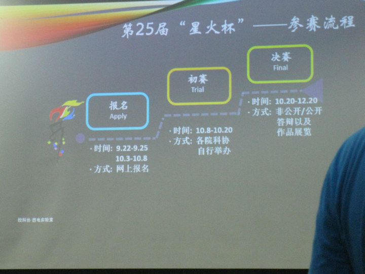 第25屆星火杯課外科技競賽參賽流程 2013-09-25 11:20:00 瀏覽次數: 第25屆星火杯馬上開始了,請在9.22-9.25或10.3-10.8期間到校科協網站http://www.xidian.cc注冊報名。院賽將在10月中旬收作品和立項申請表紙質版,10月中下旬,由老師和優秀學長進行評審,并給作品打分評級。11月上旬進行校級決賽階段,評審委員會對申報作品進行校級評審。11月下旬進行決賽作品展示及總結表彰。 來源http://www.xidian.cc/?action-viewnews-itemid-221 上一篇文章:“華創杯”巔峰對決 邀你當裁判 下一篇文章:2013世界自由軟件日西電站活動預告