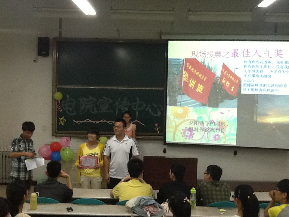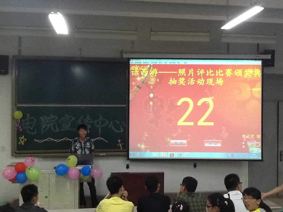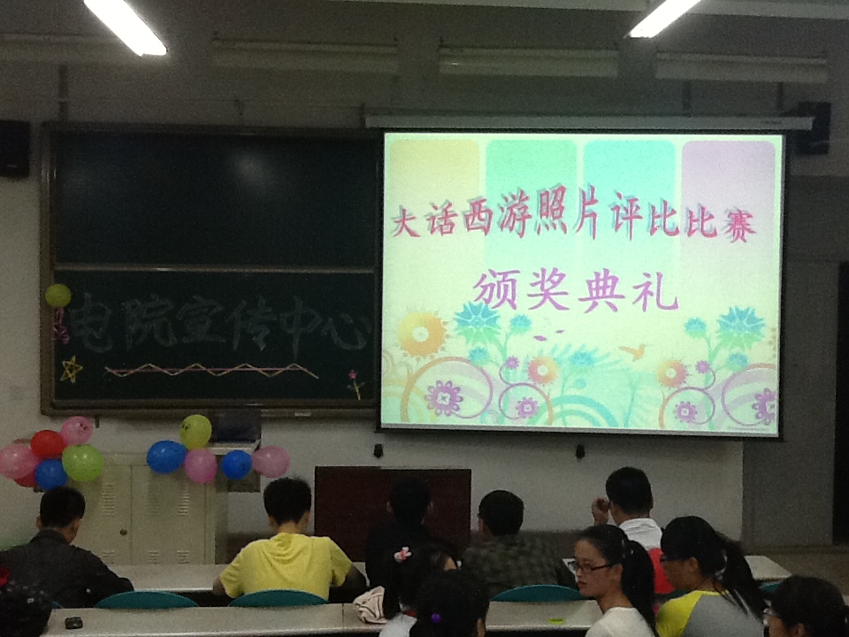 “大話西游”是向全校同學征集有關生活記憶、旅游映像等方面有故事又有特色的照片。照片的征集開始于4月底,而經過攝影部工作人員的初步篩選與網上投票,于頒獎典禮現場公布了入選名單。典禮第一項,主持人通過幻燈片的放映和在場人員的投票,決出了最佳人氣獎。接著,主持人組織了抽獎活動,活躍了現場氣氛。隨后,電院宣傳中心主席王皞、副主席韓文輝及科協主席謝武鵬等到場嘉賓為各獎項獲獎者頒發了獲獎證書和獎品。典禮末,主持人號召大家做了小游戲,既為獲獎者祝賀,又為到場者自己鼓掌。