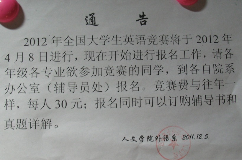 為了貫徹落實教育部關于大學英語教學改革精神,促進《大學英語課程教學要求》的進一步實施,全面提高大學生英語綜合運用能力,激發廣大大學生學習英語的積極性,不斷提高大學英語教學質量,根據高等學校大學外語教學研究會文件精神,經研究決定,我校將組織學生參加第十四屆全國大學生英語競賽(2012 National English Contest for College Students 簡稱NECCS)。