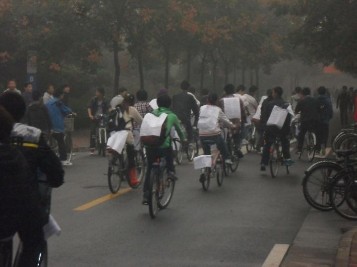 隊員們背后貼著校史信息,車頭也張貼有相關資料,當車隊停止前進原地休息時路過的同學紛紛駐足觀看隊員們身上張貼的資料,或者低頭看自行車上的宣傳頁。在車隊行駛中,領隊人員借由隨身的擴音器一遍一遍不斷地朗讀校史,簡要地介紹了從1931年到2011年這八十年來西電的風雨歷程,并詳細介紹了12日中午將會在中心廣場舉辦的各類活動。