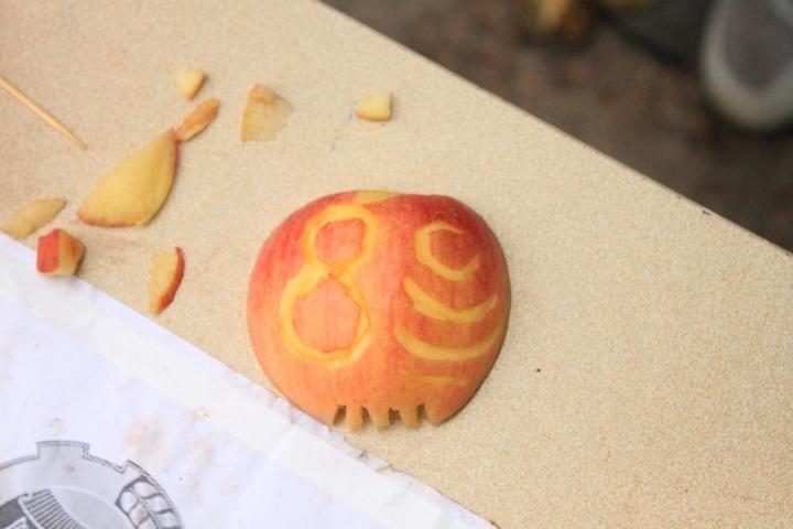 此部分的活動較娛樂,電院團委準備了三種標志,分別為西電八十周年校慶的80標志,西安電子科技大學的校徽,以及共青團團徽。參與的同學們明顯對于西電80周年校慶標志以及西電校徽興趣更為濃厚。活動開始后大家紛紛圍在桌前,小心的使用著刀具,用蘋果,香蕉,梨等水果拼成這兩個圖案,也有一些同學自己創造了標志與圖案,活動氛圍熱鬧非凡,大家用這種特殊的方式為校慶獻上自己的一份祝福。