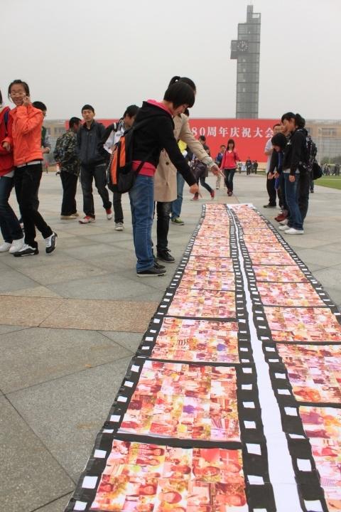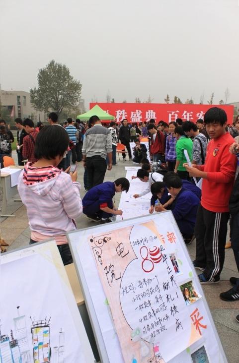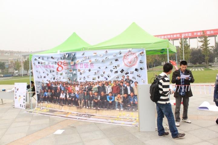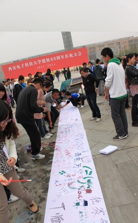 電院團委準備了兩條8米長的白布與30件長T恤以及各種顏料與畫筆,參與活動的同學在白色長布上寫自己想說的話、對母校的祝福、校徽等,也可以在白色T恤上自己設計圖案,他們將優秀作品保留了下來,每一個都合影留念。有的人在白布上寫“西電加油,校慶威武”,有的人寫的話簡單但有內涵“西電萬歲”,有的人設計的T恤衫上的內容也是用圖案畫出了“我愛西電”,所有的一切都將同學們對于母校的祝福大聲喊了出來!西電80周年校慶一定會圓滿成功!