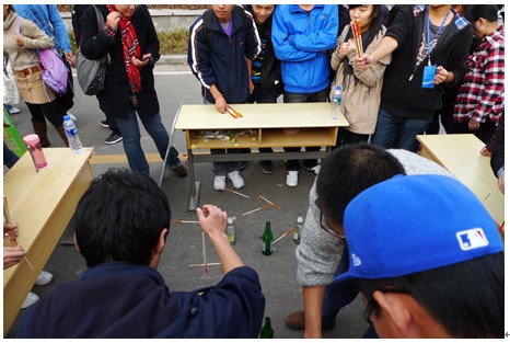 拍拍加速跳動的心臟,再向前走,只見一群同志拿著一把筷子不停地向場地中間的空酒瓶里投擲,這是在干嘛呢?再走近些,不禁被吸引注了,一根根筷子如同離弦之箭,直直地沖向酒瓶口,可不少就只是敲擊過瓶身后“當”地一聲落地,有的甚至是在瓶口華麗的轉過一圈后,遺憾的落地,這時,一根白竹筷如黑馬般廝殺而出,突入重地,它近了,又近了,哇,投進了,人群中爆發出熱烈的掌聲,不幸的是,筆者牛刀小試的十五根竹筷統統壯烈犧牲了,想來,這個名為“扔竹竿”的游戲是極需要智商和運氣的“高端產物”。