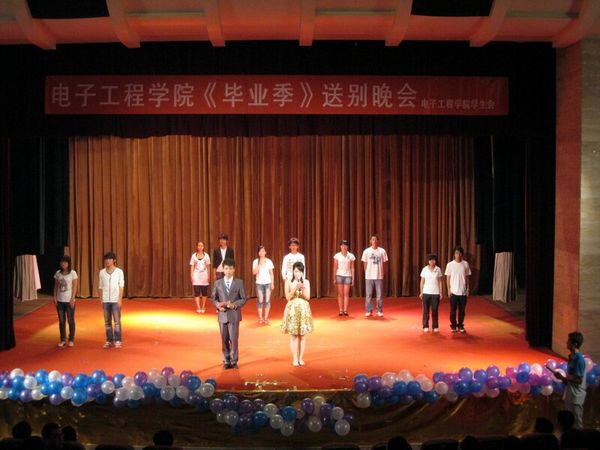 離別本來就是一件傷感的事,但所有人都興趣盅然,或許心中有幾分憂傷,但大家都用自己最好的一面迎接大學四年最后一次聚首。舞臺邊緣,藍、白、紫色的氣球沒有平時紅黃的喜氣,但正符合了離別的氛圍。盡管所有人都沒有將離別與不舍表現在臉上,但整個劇場中別離的傷感氣氛卻讓人有落淚的沖動。整場晚會由節目和活動穿插組成。同學們各展其才,大一、大二、大三的同學用自己的歌聲與舞姿為學長學姐們送去祝福。歌曲串燒、音樂劇《畢業說再見》等,穿插的各種形式的節目都讓大家回味無窮。游戲環節則讓大家更為驚嘆,猜詞游戲中“916”、“保研路”、“跳樓塔”、“給力”等詞語讓表演者手舞足蹈,猜詞者滿頭霧水,臺下觀眾更是笑的前仰后合。第二輪游戲中校史、院史以及各種問答則讓大家進一步了解了電院的人文歷史。伴著最后那首《老男孩》的歌聲,大家依依不舍的走出大活小劇場。
