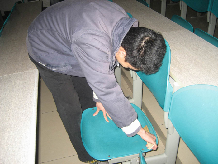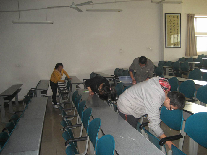 他們來自于人文學院學生會、人文學院團委、機電院團委、計算機院團委、理學院團委、青年志愿者服務隊、通院志愿者服務隊和西電愛心社等隊伍。他們手提清潔工具,在集結完畢后走向了教學樓B樓的各個教室,馬上開始了緊張有序的勞動。
