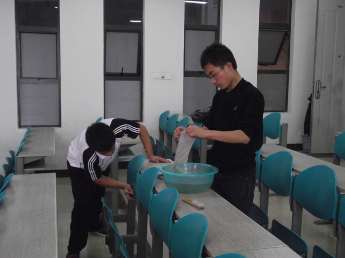 同學們干起活來都相當投入。誰說90后不會干家務,不能干家務?他們拿起掃帚抹布來都有模有樣額。同學們分工也很細致,他們分成一個個小組,一組打掃一個教室。不一會兒工作就結束了。