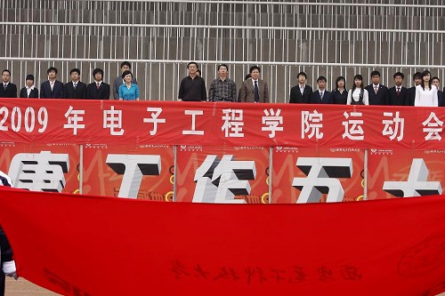 E流網訊(通訊員孔東)4月12日,西安電子科技大學電子工程學院2009年運動會在南校區塑膠操場成功舉行。院黨委書記鄧卓峰老師,校體育部部長徐國富老師,院黨委副書記徐克老師,校醫院副院長楊瑩雪老師等人出席了開幕式并觀摩了整個運動會。學院全體輔導員與2000多名同學一起參加了開幕式。