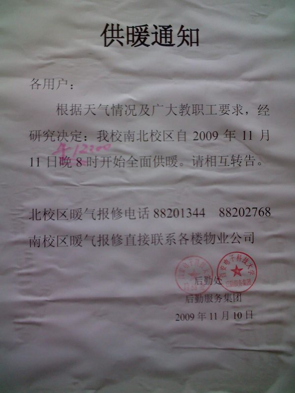 供暖通知 11月11日中午12點 2009-11-11 09:55:00 瀏覽次數: 我校南北校區自11月11日晚8時中午12時開始提前供暖。 北校區暖氣報修電話:88201344 88202768,南校區暖氣報修直接聯系各樓物業管理公司。 來源:家屬院中門櫥窗 上一篇文章:青年教師培訓啟動 名師梁昌洪講述“導師的故事” 下一篇文章:地熱水查詢時間