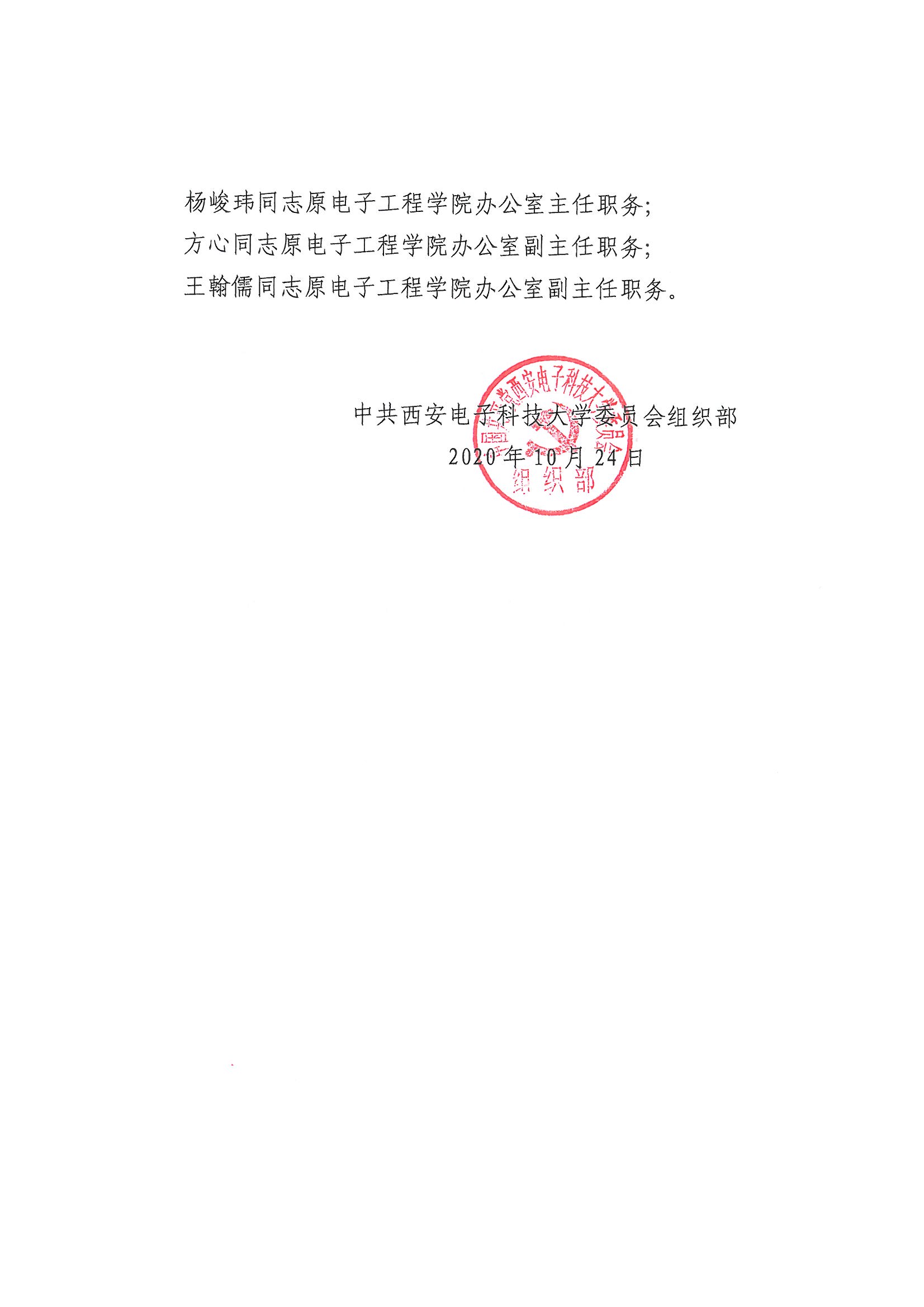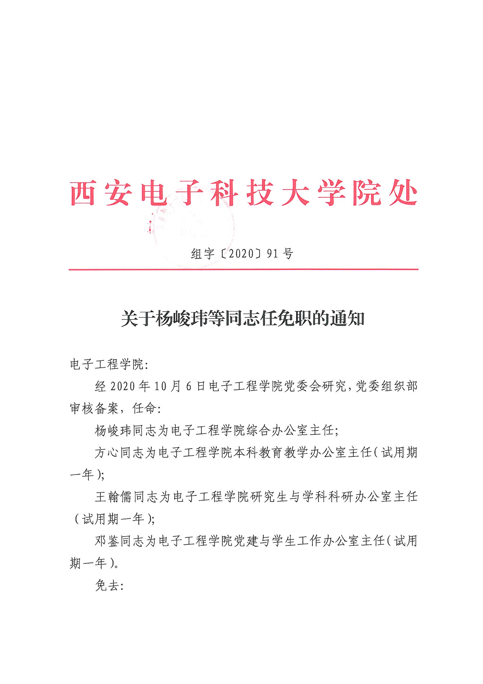 關于楊峻瑋等同志任免職的通知 2020-12-01 14:51:00 瀏覽次數: 責任編輯:鄧鑒 信息來源:http://zzb.xidian.edu.cn/new/?play=show&id=2868 上一篇文章:校長楊宗凱調研電院“不忘初心、牢記使命”主題教育開展情況 下一篇文章:電子工程學院黨委理論學習中心組召開視頻會議集中學習