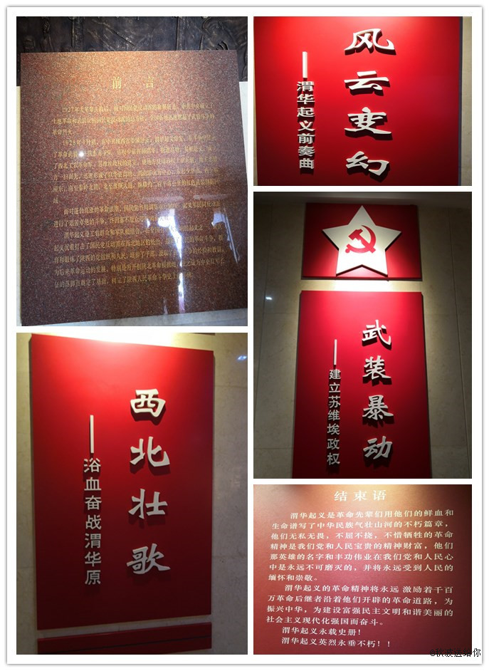 之后我們移步來到了渭華起義陳列大廳,首先映入眼簾的是鄧小平、徐向前、習仲勛等領導同志為渭華起義紀念館的題詞,然后是“風云變幻、西北壯歌、武裝暴動”等各部分的簡介和歷史圖片。我們在小講解員的帶領下參觀了整個渭華起義展覽館,感受到共產黨人為了勞苦大眾的解放,不怕犧牲,浴血奮戰的英雄事跡。據介紹,渭華起義是在全國大革命陷入低谷時,繼南昌起義、秋收起義和廣州起義之后,西北地區在1928年5月爆發的最具全國影響的起義之一,他打響了西北武裝革命的第一槍。這次起義是在劉志丹等先烈的領導下,以華州高塘、渭南崇凝塔為中心的渭華地區進行的大規模農民武裝和革命軍隊配合的渭華起義,形成了方圓數百里的紅色區域和革命武裝割據的局面,它沉重的打擊了西北反動統治階級的囂張氣焰,鼓舞了西北人民的革命斗志,同時也教育和鍛煉了陜西人民。雖然起義最終因敵眾我寡失敗了,但是通過這次起義為我黨培養了許多向劉志丹、謝子長這樣的斗爭骨干和領導人物,積累了豐富的斗爭經驗,為后來創建陜北紅軍和革命根據地打下了堅實的基礎。革命先輩們用鮮血和生命譜寫了中華民族氣壯山河的不朽篇章,他們奮不顧身,不屈不撓,艱苦奮斗的大無畏精神是讓我們十分敬佩的。
