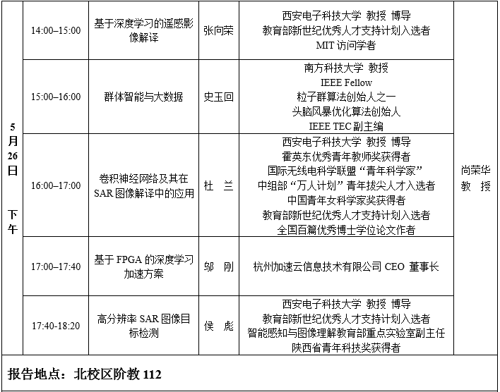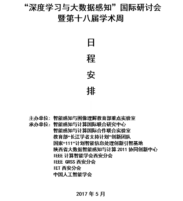 “深度學習與大數據感知”國際研討會暨第十八屆學術周日程安排 2017-05-23 21:49:00 瀏覽次數: 上一篇文章:智能感知與圖像理解教育部重點實驗室師生參加第37屆IEEE國際地球科學與遙感大會 下一篇文章:羅德與施瓦茨高校行-西安電子科技大學站